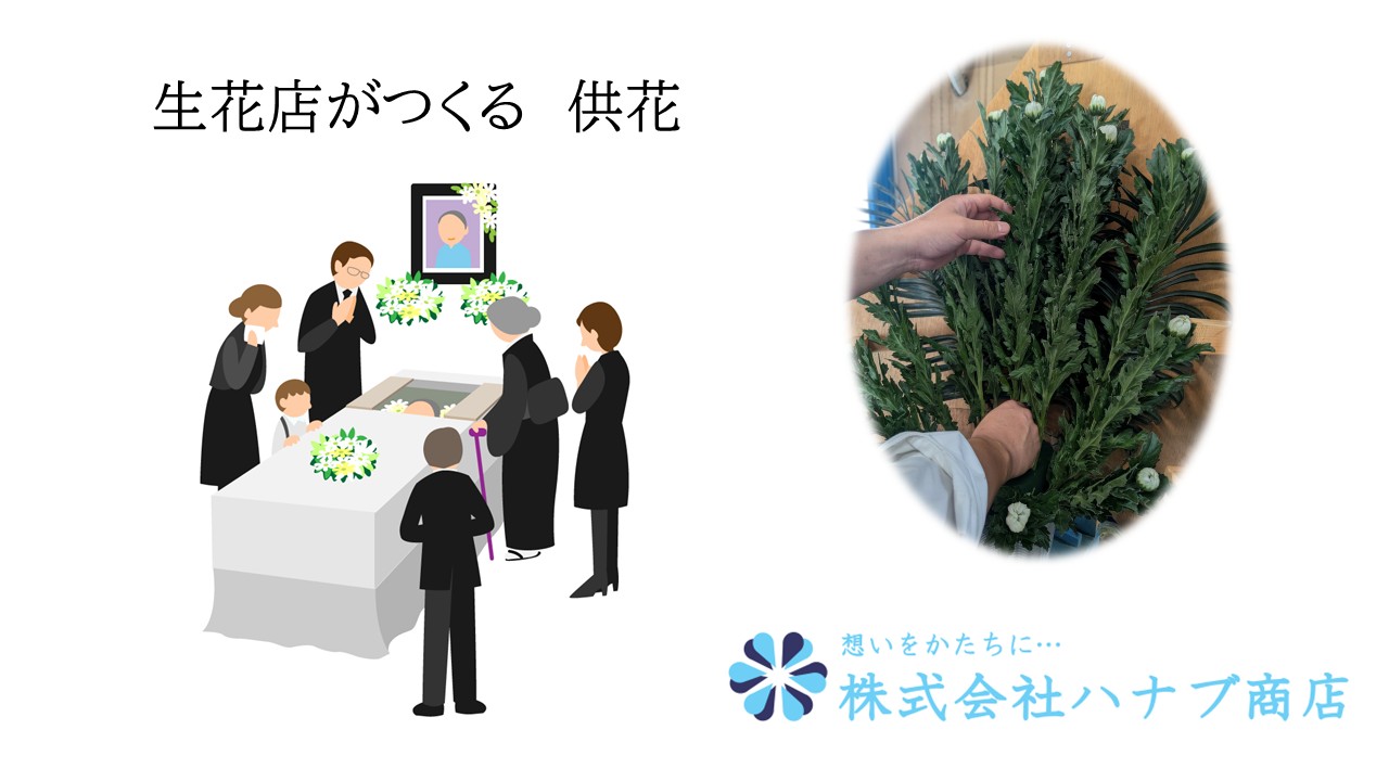 生花店でもあるハナブ商店の生花部では 新鮮で上質なお花を提供いたしております。 ご遺族様にとって大切な故人様へのお供え花を心を込めて作成いたします。